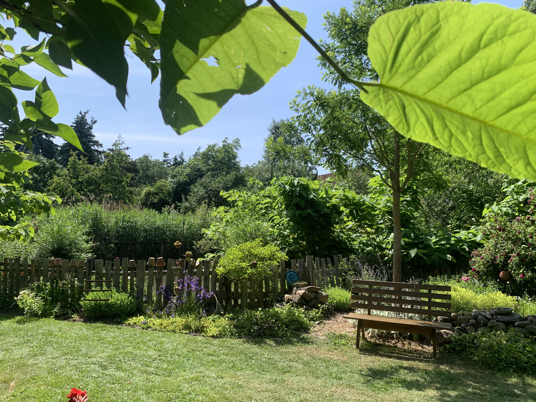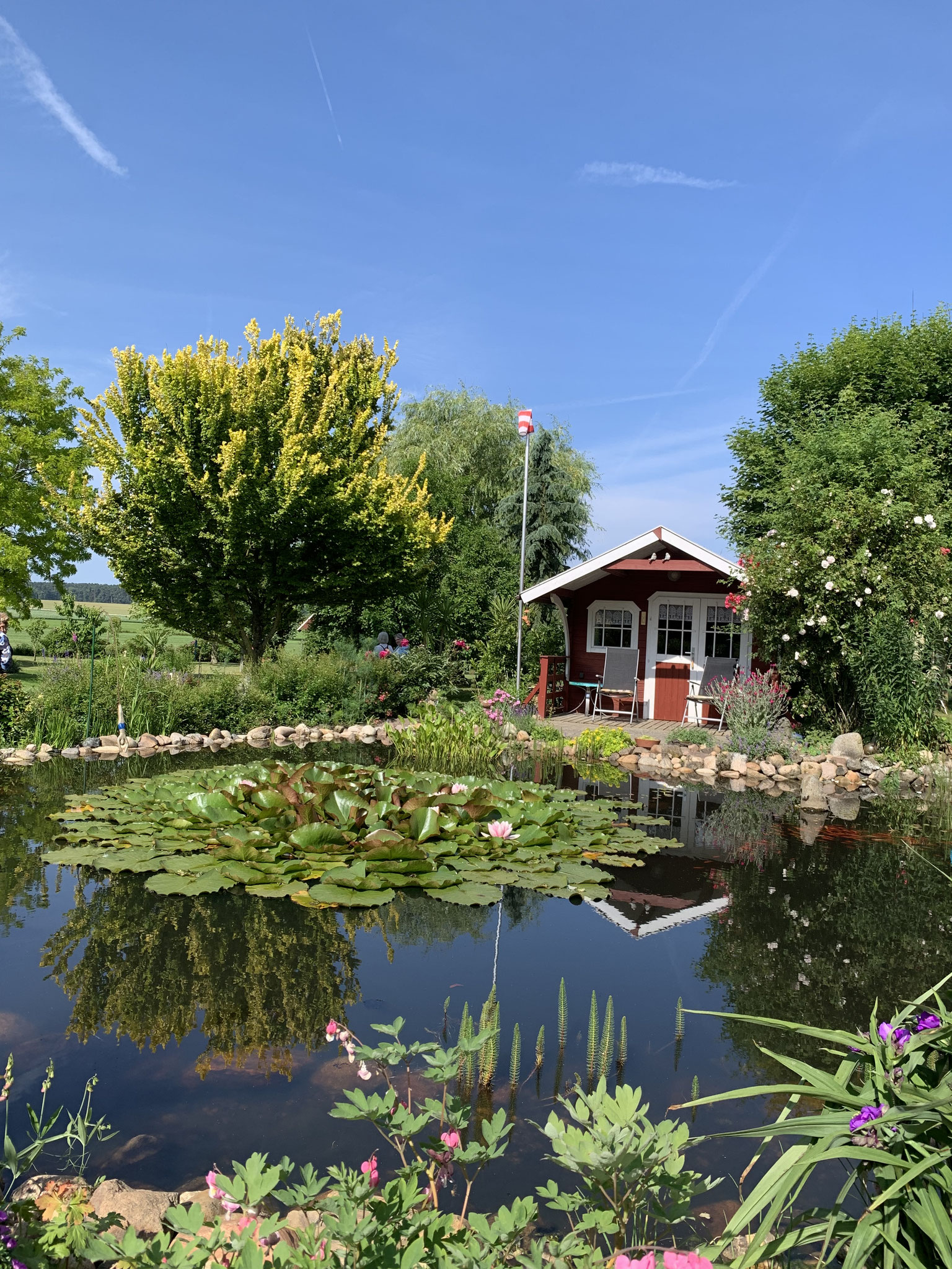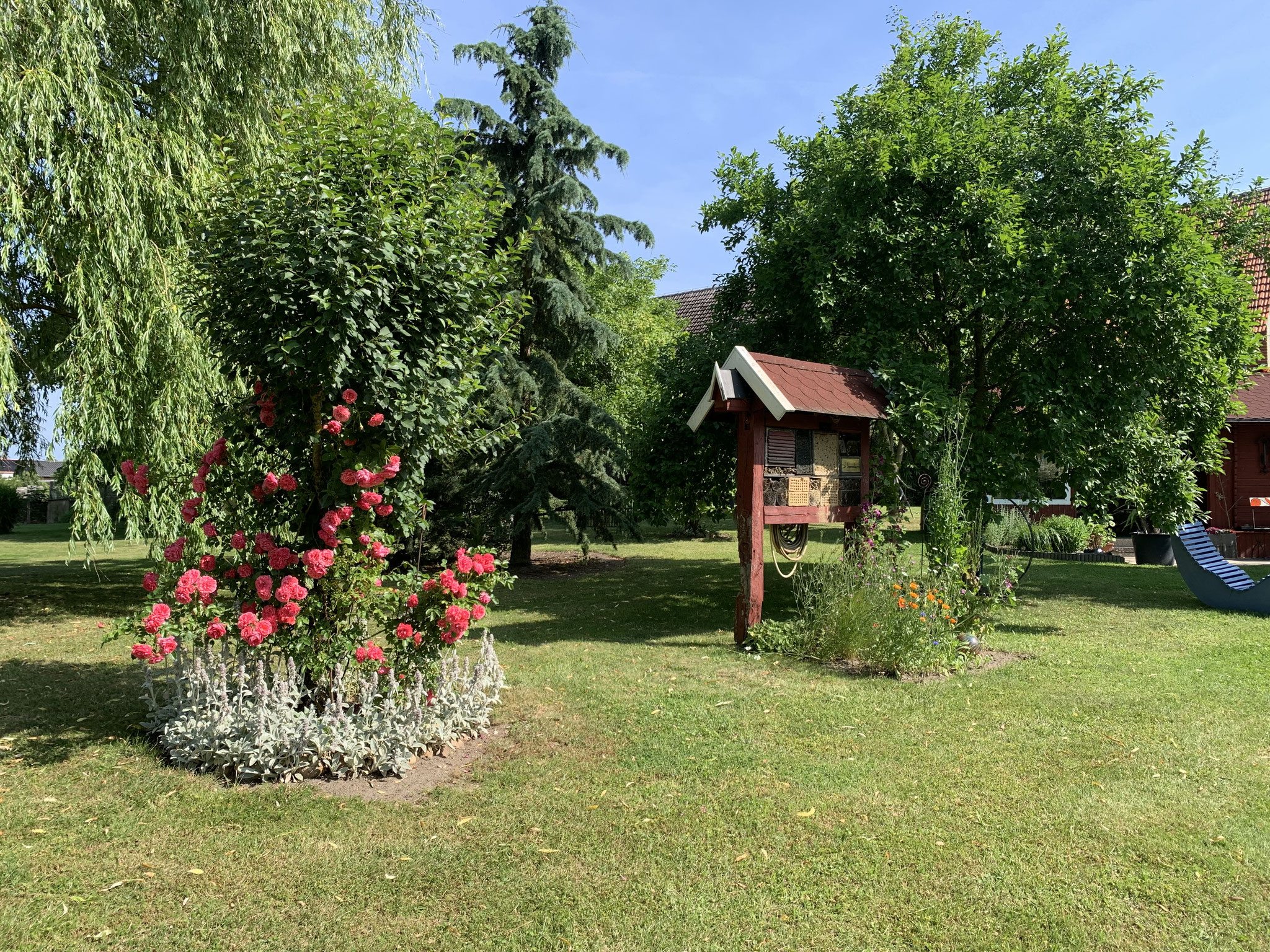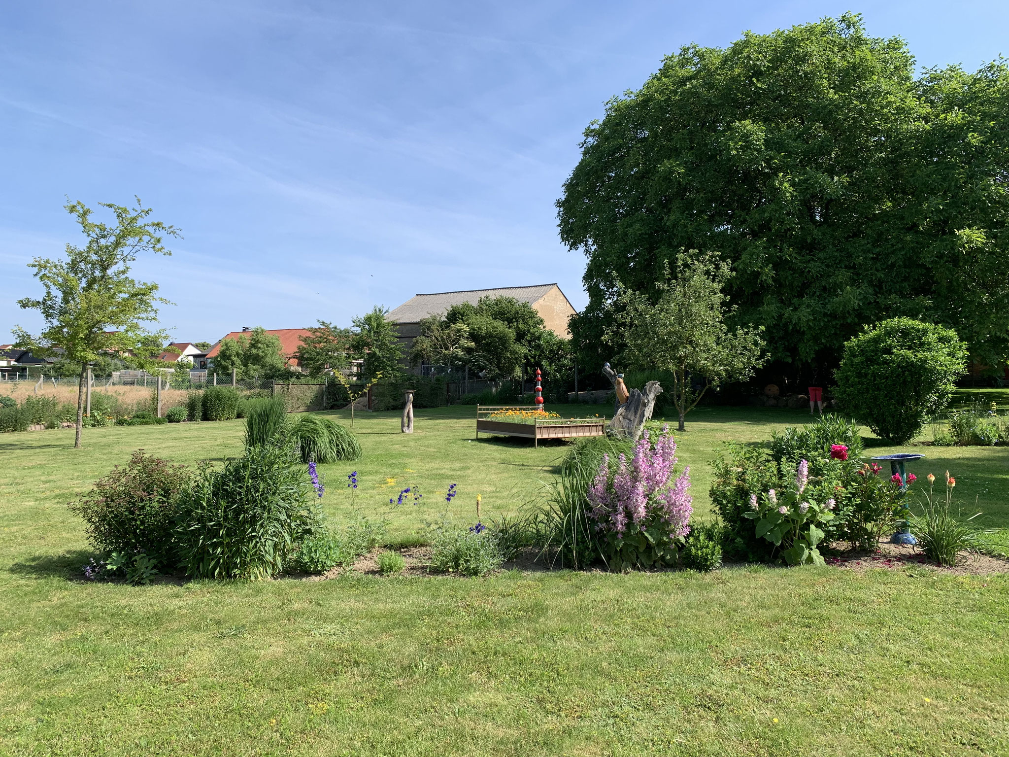 Kräuterrasenflächen, Nutz- und Ziergehölze, Rosen und Stauden wechseln sich ab mit Gemüse- und Hochbeeten. Ein großer Gartenteich ist Teil dieser Vielfalt auf ca. 8.000 m², ein Garten der Nutzen und Erholung vereint.