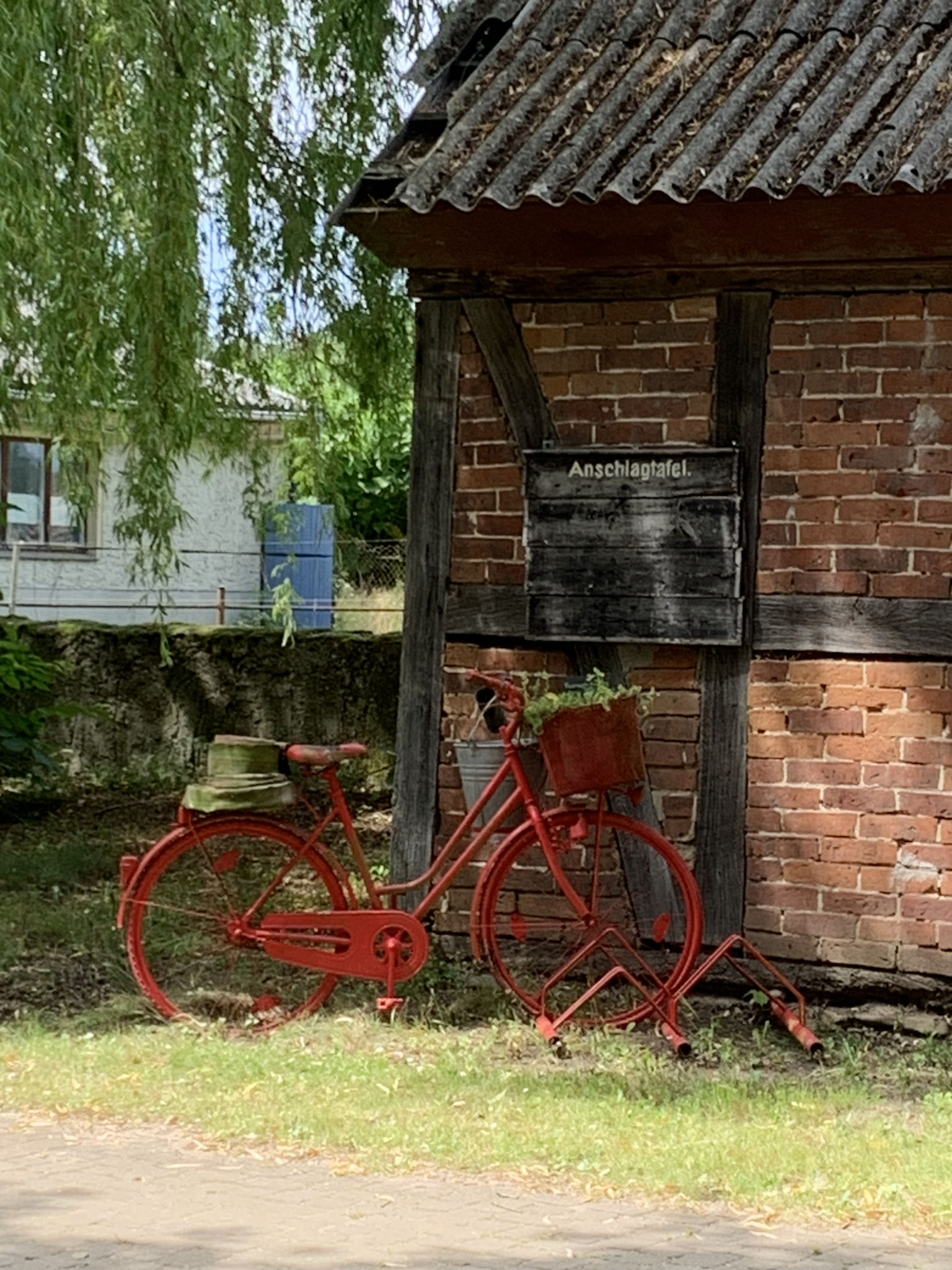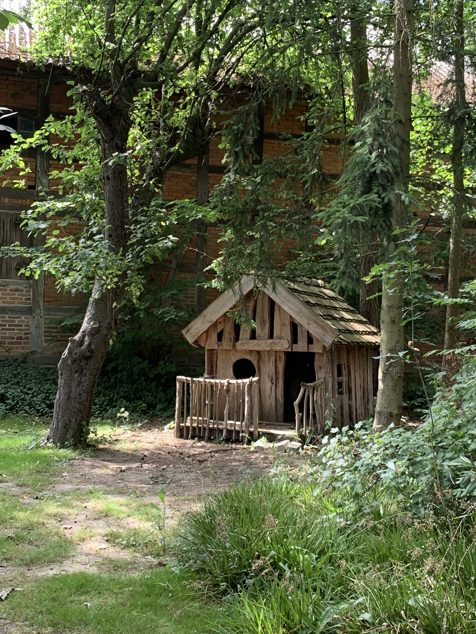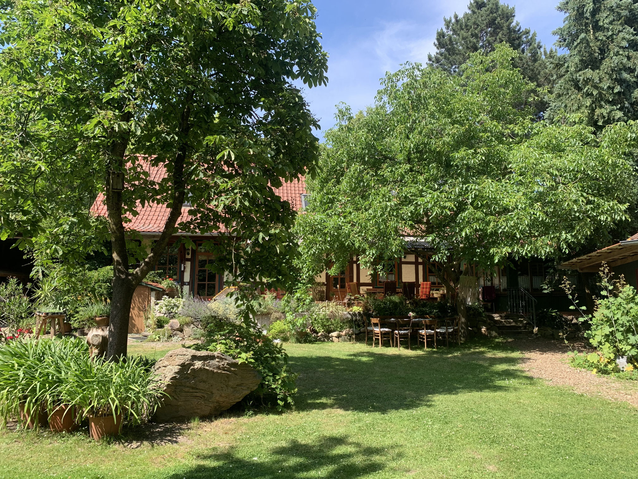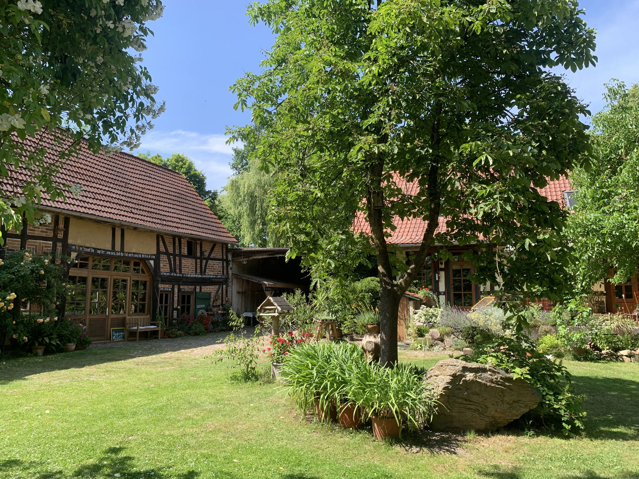 Ein historisches Fachwerkgebäude beherbergt ein Gartencafé, in dem wir altmärkischen Butterkuchen genießen konnten.